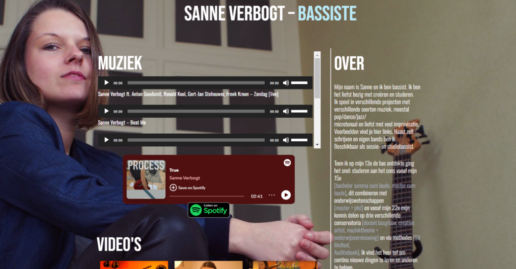 Bezoekers kunnen eenvoudig door haar werk scrollen, en op de website muziek luisteren van spotify of direct. Alles is compact gehouden, zoals de video’s die vergroten wanneer erop geklikt wordt – zo blijft de pagina snel en strak.